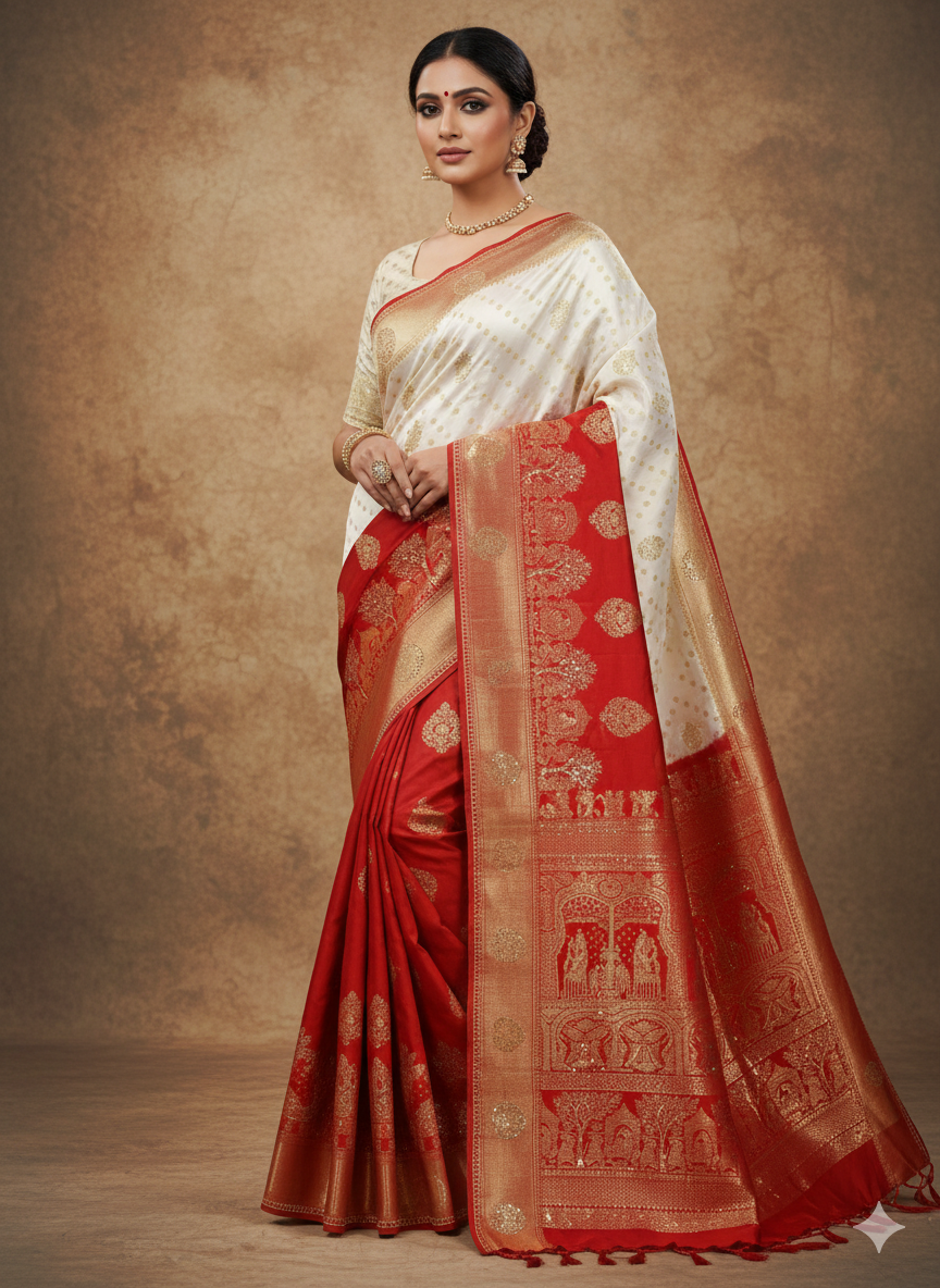 Ivory White & Royal Red • Heavy Golden Zari Weaving